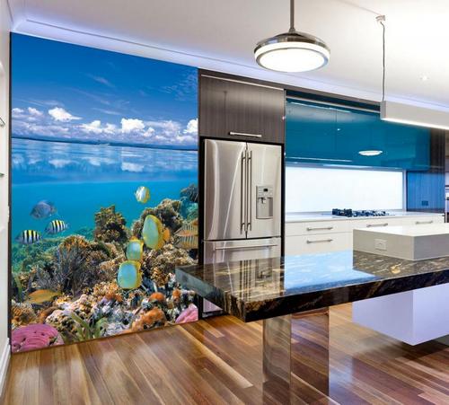 Фотообои оживят комнату и подчеркнут её стиль. Данный отделочный материал способен зрительно увеличивать или уменьшать пространство, зонировать помещение и выделять функциональные зоны, маскировать недостатки стены. Для маленькой кухни подойдёт картина на фотообоях компактных размеров. Для большой - великолепным решением будет изображение на всю стену. Не оклеивайте фотообоями всё пространство, это перегрузит помещение. В данном случае выбирайте влагоустойчивое покрытие, с которого можно без труда убрать загрязнения. В гостиной фотообои выделят зоны отдыха и рабочего пространства. Для спальни выбирайте спокойную расцветку. В детской комнате уместными будут красочные изображения с героями из любимых мультфильмов ребёнка.