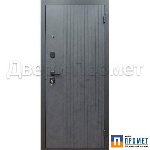 Производство Россия, место установки в помещении, толщина полотна 91 мм., толщина наружного листа стали с покрытием 1.5 мм., основной замок ПРОМЕТ 32.11 цилиндровый, дополнительный замок ПРОМЕТ 30.01 сувальдный, внешняя отделка фрезерованная МДФ панель, внутренняя отделка мдф панель с вертикальной фрезеровкой, цвет внешнего покрытия букле графит, цвет внутреннего покрытия бетон снежный, гарантия производителя 1 год.