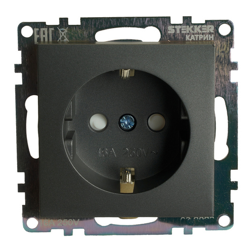 Розетка STEKKER GLS16-7110-06 на 1 гнездо, с заземлением. Материал: поликарбонат, латунь, цвет графит, размер 72*72*43мм. Номинальное напряжение 250, номинальный ток 16А, диапазон рабочих температур 0..+35°C, IP20