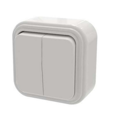 Выключатель двухклавишный открытой проводки, цвет – белый. Тип зажимов винтовой; Степень защиты IP-20; Напряжение в сети 220/250 В; Частота тока 50 Г; Номинальный ток 10 А; Материал корпуса АБС-пластик; Материал деталей контактных групп латунь; Сечение присоединяемых к контактам проводов от 0,1 до 2,5 мм2.