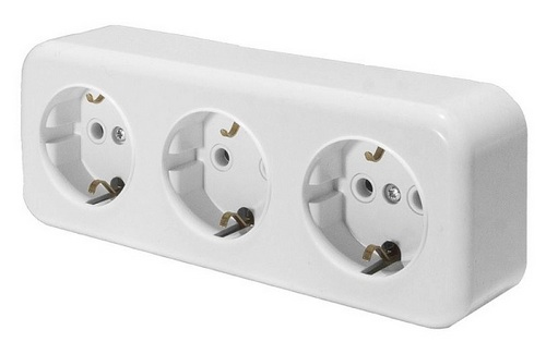 Трехместная розетка штепсельная двухполюсная открытой установки с заземляющим контактом предназначена для присоединения электрических приемников с номинальным напряжением 250 В к электрической сети переменного тока в нормальных климатических условиях внешней среды по ГОСТ 15150 и ГОСТ 15543.1.