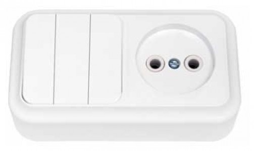 Блок электроустановочный открытой проводки 3В-РЦ-525, розеток, выключатель. Блоки предназначен для управления освещением путем включения-выключения питающего провода и подключение через универсальную розетку электрических бытовых устройств. Состоит из комбинации трехклавишного выключателя с номинальным током 10А и розетки с номинальным током 16А. Корпус произведен из высокопрочного пластика белого цвета.