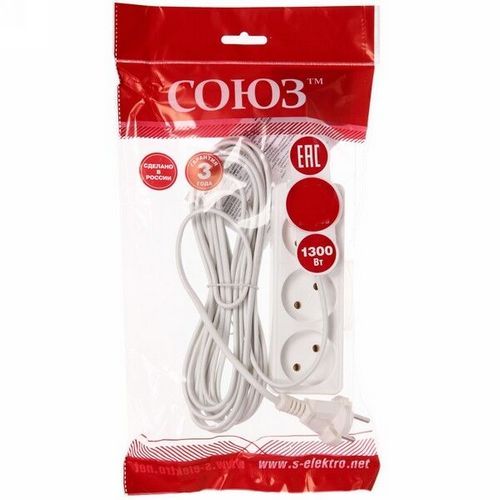 Бытовой удлинитель 2200 Вт 3гн. ПВС 1,5м Союз - высококачественный пластиковый удлинитель с тремя розеточными гнездами. Изделие активно применяется для подключения нескольких бытовых электроприборов с короткими шнурами питания. Температура окружающей среды от +1°С до +25°С с допустимым временным увеличением до +35°С.