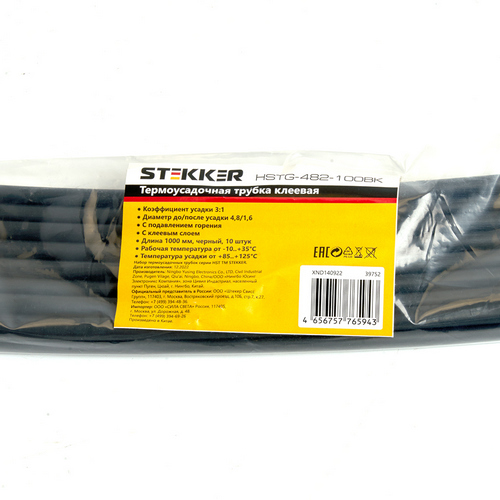 Термоусадочные трубки STEKKER HSTG-482-100BK, длина 1000мм. 10шт. в наборе, цвет: черный. Коэффициент усадки 3:1, диапазон рабочих температур -10..+35°C, температура усадки +85..+125°C, номинальный ток 32А, для проводов сечением мм2.