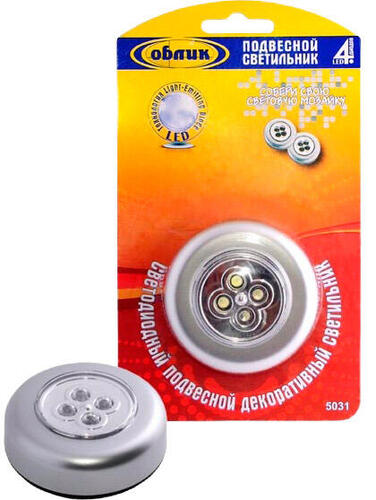 Подвесной светильник источник света: 4 светодиода двусторонний скотч на обратной стороне позволяет размещать светильник в любом месте и положении. пластиковый корпус работа от 3х элементов типа ААА.