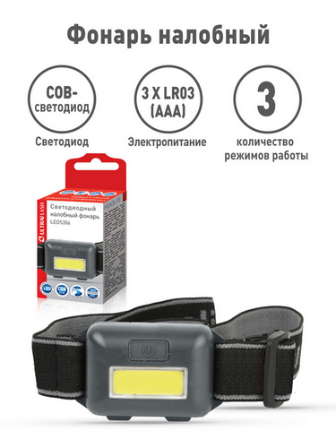 Фонарь Ultraflash электрический светодиодный налобный. Цвет корпуса: серый. Работает от 3 X AAA батареек (не входят в комплект). Материал корпуса: ABS — пластик. Источник света: COB — светодиод с потребляемой мощностью 0,95 ватт с цветовой температурой 6500К со световым потоком 49 люмен. Дистанция освещения — до 15 метров. Три режима работы. Выключатель — двухпозиционный кнопочного типа с каучуковой накладкой. Время работы при использовании алкалиновых батареек: режим 100% яркости 49 люмен — до 2 часов, режим 50% яркости 24 люмен — до 2,5 часов, мигающий режим — до 3 часов. Комплектация: фонарь, эластичный ремешок для ношения на голове, инструкция, упаковка. Степень пыле-влаго-защиты IPX4. Упаковка — коробка. Максимальный линейный размер фонаря 6 см. Размер упаковки 4 см x 2,6 см x 9 см. Вес без упаковки 0,018 кг. Вес с упаковкой 0,028 кг.