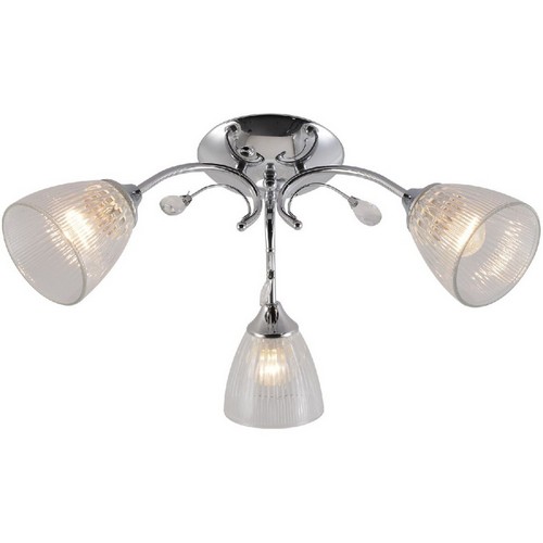 Люстра имеет практичную геометрию: её высота составляет 200 мм, диаметр — 570 мм. Для установки используется надежная монтажная пластина. Вес люстры — всего 1.4 кг, что делает её удобной для самостоятельной установки. Арматура люстры изготовлена из металла — обеспечивает прочность и надежность конструкции, хром добавляет люстре технологичность и лаконичность. Плафон выполнен из стекла создающего изящный и современный вид, а его поверхность прозрачного цвета создающий воздушный и лёгкий эффект. Плафоны направлены в стороны создавая равномерное освещение.