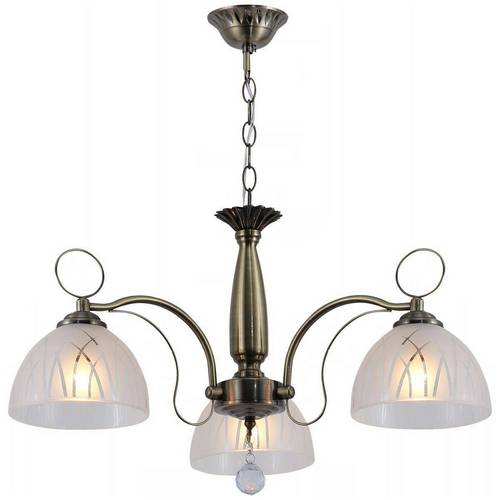 Элегантный дизайн — античная бронза металлической арматуры сочетается с белыми стеклянными плафонами.