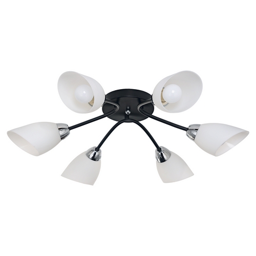 Потолочный светильник 50751/6CR+BK WT от бренда ЭкономСвет. Каркас выполнен из материала металл, цвет хром, черный. Плафоны (светорассеиватели) выполнены из материала пластик, цвет белый. Цоколь E14 рассчитан на лампы максимальной мощности до 60 Вт, а максимальная площадь освещения составит до 13 м².