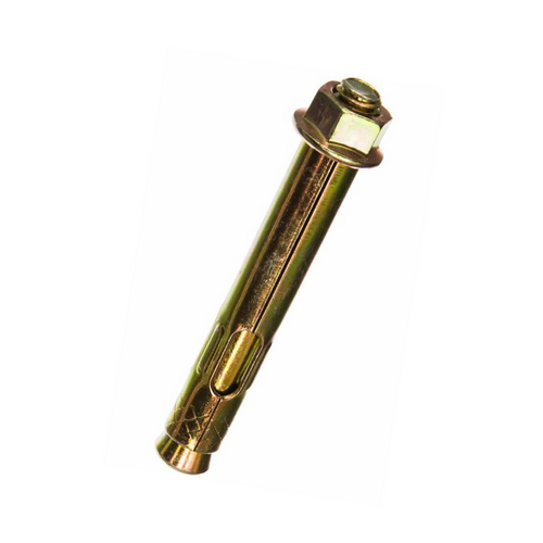 Анкерный болт с гайкой применяется при монтаже различных элементов конструкций в основания из полнотелого бетона, кирпича и камня. Для установки анкерного болта с гайкой сверлится отверстие. Для закручивания гайки используется ключ. Анкерный болт с гайкой представляет собой цилиндрическую гильзу состоящую из трех элементов и шпильки, на одном конце которой находится конусный элемент. При закручивании гайки, конусная часть шпильки расширяет элементы гильзы, и фиксирует анкер в основании. Анкер болт со шпилькой и гайкой произведён из углеродистой стали и электрооцинкован. Цинковое покрытие имеет жёлтый цвет.