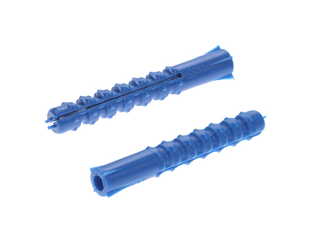 Двухраспорный дюбель с малой конусностью, сегменты дюбеля имеют ребра, на которых дополнительно предусмотрены шипы. У основания выполнено четыре контрящих ребра. Изготавливается из полипропилена. Дюбель надежно фиксируется в основании, не проворачивается при ввинчивании шурупа, а также не допускает люфт шурупа. Предназначен для применения в быту и в строительстве, для крепежа в полнотелых материалах – кирпич, изделия из бетона, натуральный камень.