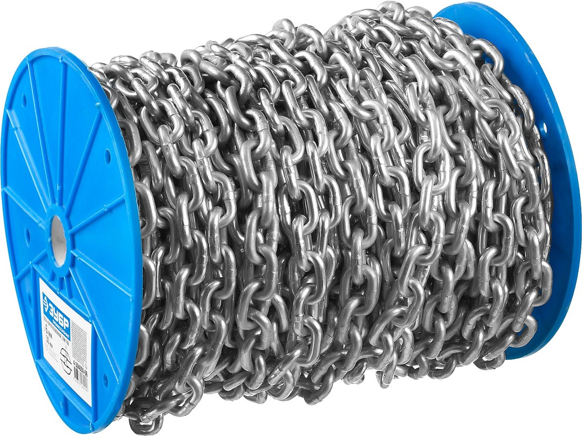 Цепь короткозвенная является сварной и имеет звено с шагом равным 28 мм и шириной составляющей 34 мм. Данная цепь не рекомендована для подъемных работ и используется исключительно для производства растяжек, подвесов и в декоративных целях при создании ограждений. Короткозвенная цепь калибром изготавливается из углеродистой стали и проходит процедуру гальванического цинкования.
