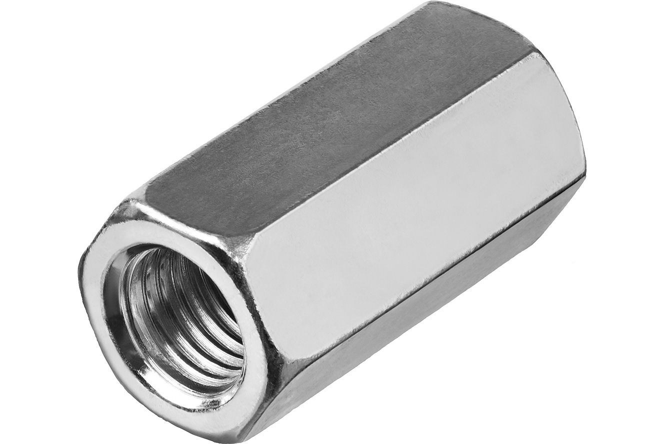 Переходная гайка используется для соединения и удлинения резьбового крепежа вроде шпилек и болтов. Отличительной особенностью подобных изделий является большая высота корпуса, превосходящая ширину почти вдвое. Изготовлена гайка из высокопрочной оцинкованной стали.