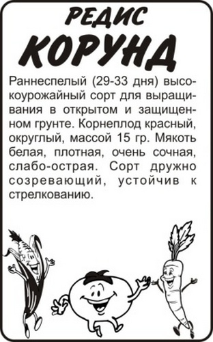 Раннеспелый (29-33 дня) высокоурожайный сорт для выращивания в открытом и защищенном грунте. Корнеплод красный, округлый, массой 15 г. Мякоть белая, плотная, очень сочная, слабо-острая. Сорт дружно созревающий, устойчив к стрелкованию.
