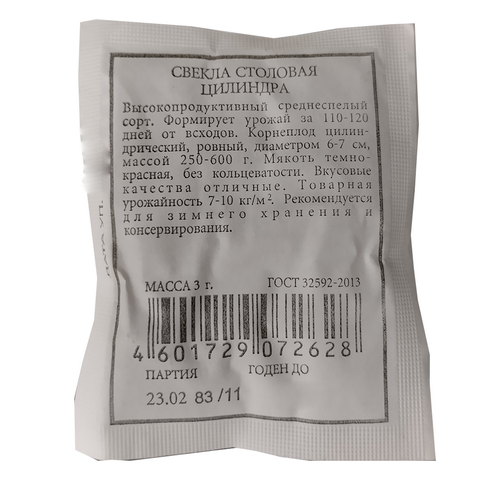 Высокопродуктивный среднеспелый сорт. Формирует урожай за 110-120 дней от всходов. Корнеплод цилиндрический, ровный, диаметром 6-7 см, массой 250-600 г. Мякоть темно-красная, без кольцеватости. Вкусовые качества отличные. Товарная урожайность 7-10 кг/м2. Рекомендуется для зимнего хранения и консервирования.