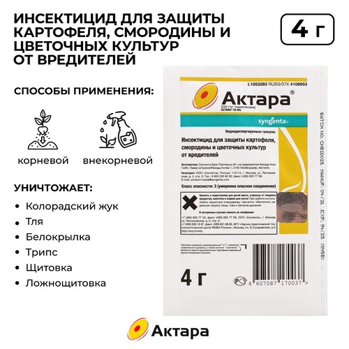 АКТАРА, ВДГ — инсектицид кишечно-контактного действия, предназначен для защиты: картофеля — от проволочника и наземных вредителей; капусты — от капустной мухи; гороха — от тли, зерновки; овощных и цветочных культур закрытого и открытого грунта — от тли, белокрылки, трипсов, щитовок и ложнощитовок; винограда и яблони — от медяниц, цикадок, цветоеда. Инсектицид применяют как для опрыскивания растений в период вегетации, так и для внесения в почву. При внесении в почву обладает выраженной системной активностью.