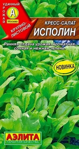 Это холодостойкий сорт кресс-салата с крупными листьями. Растения быстро растут и образуют компактные и густые розетки листьев. Первую зелень можно собирать уже через 2–3 недели после появления всходов.