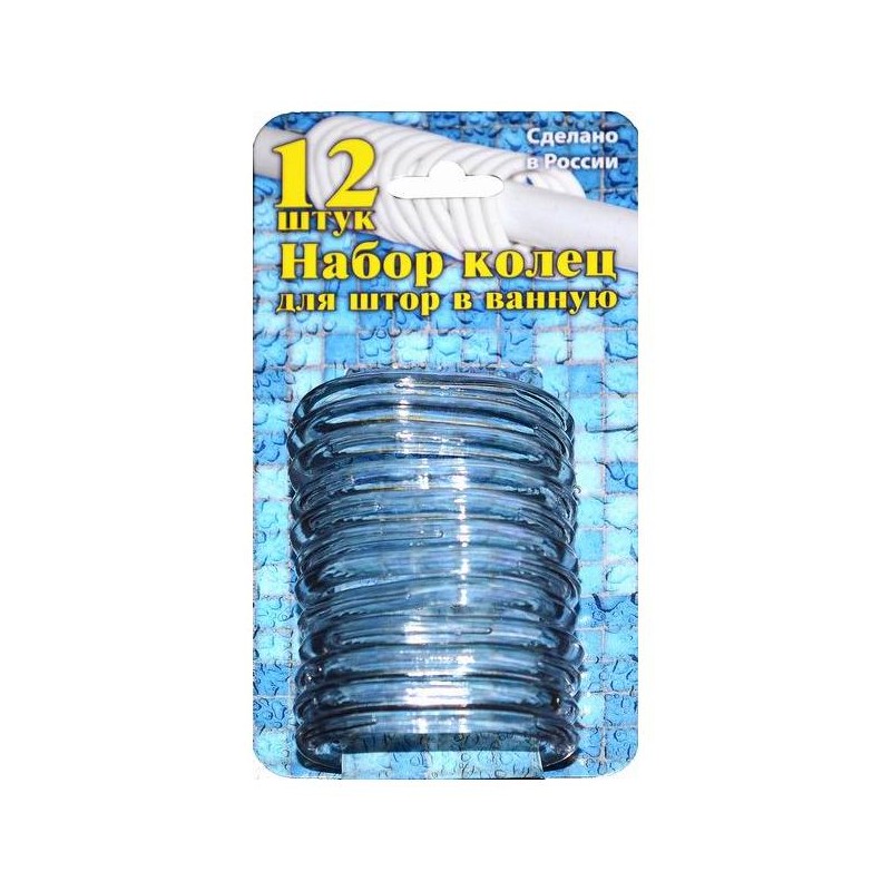 Набор из 12 пластиковых колец для крепления шторки для ванной комнаты на карниз. Кольца имеют продолговатую форму и вставляются в люверсы шторки.