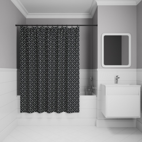 Текстильная штора для ванной черного цвета с белым геометричным принтом в стиле ар-деко.