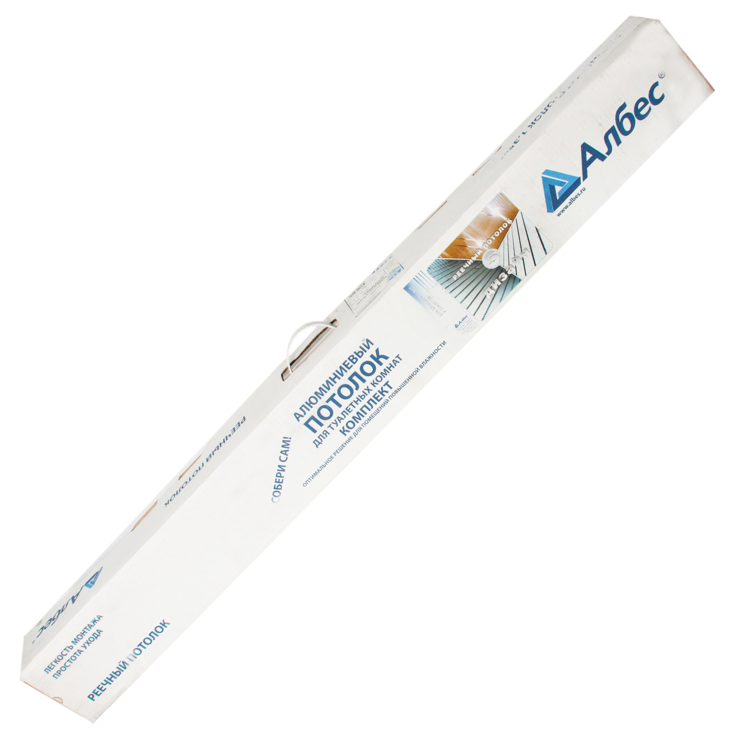 Комплект потолка 1,35 х 0,9 м предназначен для устройства подвесного реечного потолка в туалетных комнатах. Состав: алюминий. Комплектация: рейка - 9 штук, п-профиль - 4 штуки, гребенка - 2 штуки.