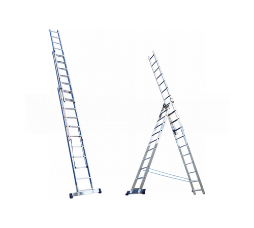 Лестница алюминиевая трехсекционная 3х7 многофункциональная лестница с 3-мя секциями по 7 противоскользящих ступеней в каждой секции. Изготовлена из высокопрочного алюминиевого профиля, с развальцованными ступенями и длинным стабилизатором. Допустимая нагрузка до 150 кг.