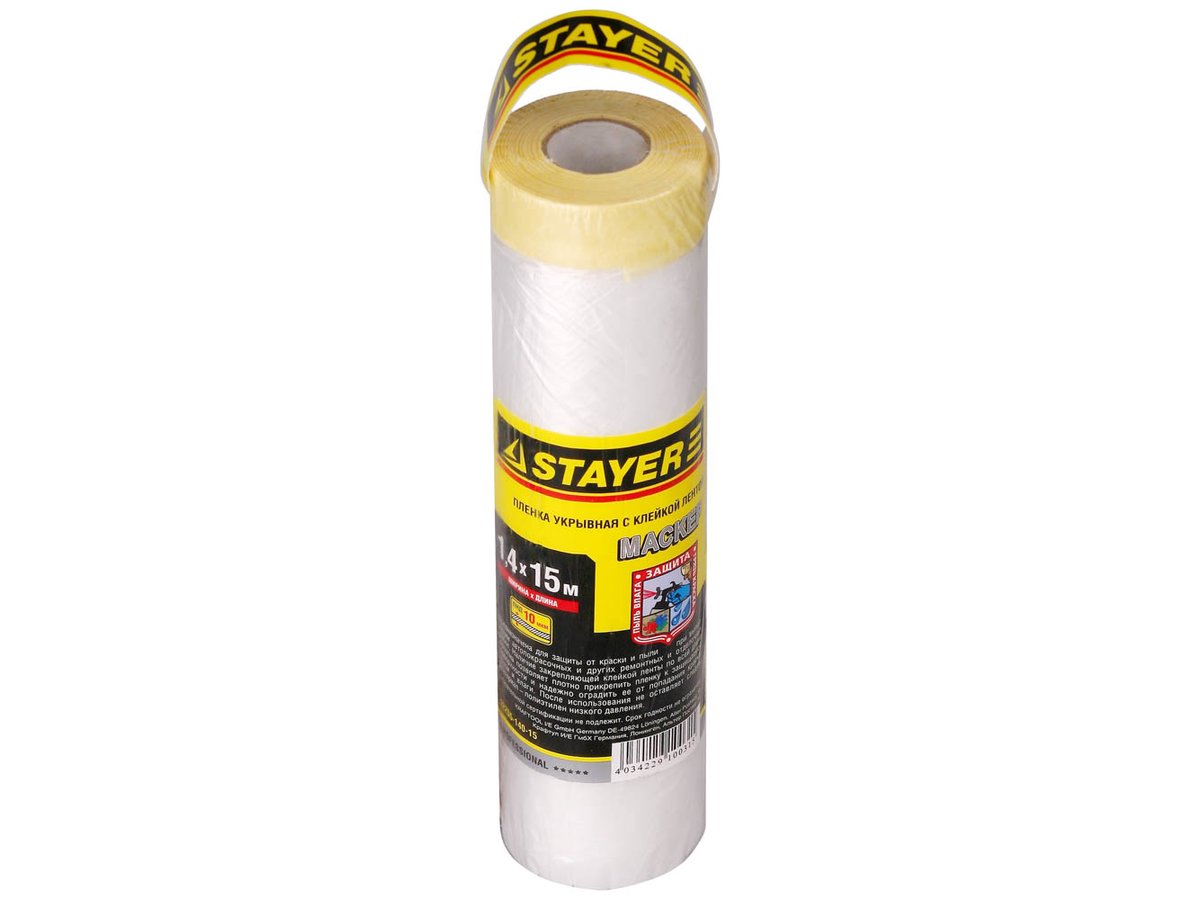Пленка STAYER обеспечит надежную защиту поверхности от пыли, грязи, влаги и краски при выполнении автопокрасочных и других ремонтных и отделочных работ. Закрепляющая клейкая лента по всей длине полотна позволяет плотно прикрепить пленку к защищаемой поверхности, не оставляя следов после использования. STAYER - качество, проверенное временем. Длина: 15 м. Ширина: 1,4 м. Толщина: 9 мкм. Материал: полиэтилен низкого давления.