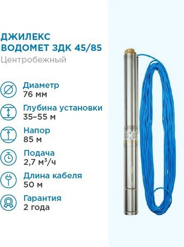 Насос ВОДОМЕТ 3ДК 45/85 от компании «ДЖИЛЕКС» используется для подачи воды из скважин, резервуаров и водоемов. Модель применяют для системы водоснабжения и полива.